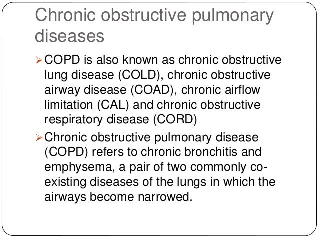 Chronic obstructive pulmonary diseases copd is also known as chronic obstructive lung disease cold chronic obstructive airway disease coad chronic airflow limitation cal and chronic obstructive respiratory disease cord chronic obstructive pulmonary disease copd refers to chronic bronchitis and emphysema a pair of two commonly co existing diseases of the lungs in which the airways become narrowed. Chronic obstructive pulmonary disease copd is a common preventable and treatable disease that is characterized by persistent respiratory symptoms and airflow limitation that is due to airway and or alveolar abnormalities usually caused by significant exposure to noxious particles or gases. The global initiative for chronic obstructive lung disease gold works with health care professionals and public health officials around the world to raise awareness of chronic obstructive pulmonary disease copd and to improve prevention and treatment of this lung disease. Definition of copd copd a common preventable and treatable disease is characterized by persistent airflow limitation that is usually progressive and associated with an enhanced chronic inflammatory response in the airways and the lung to noxious particles or gases.