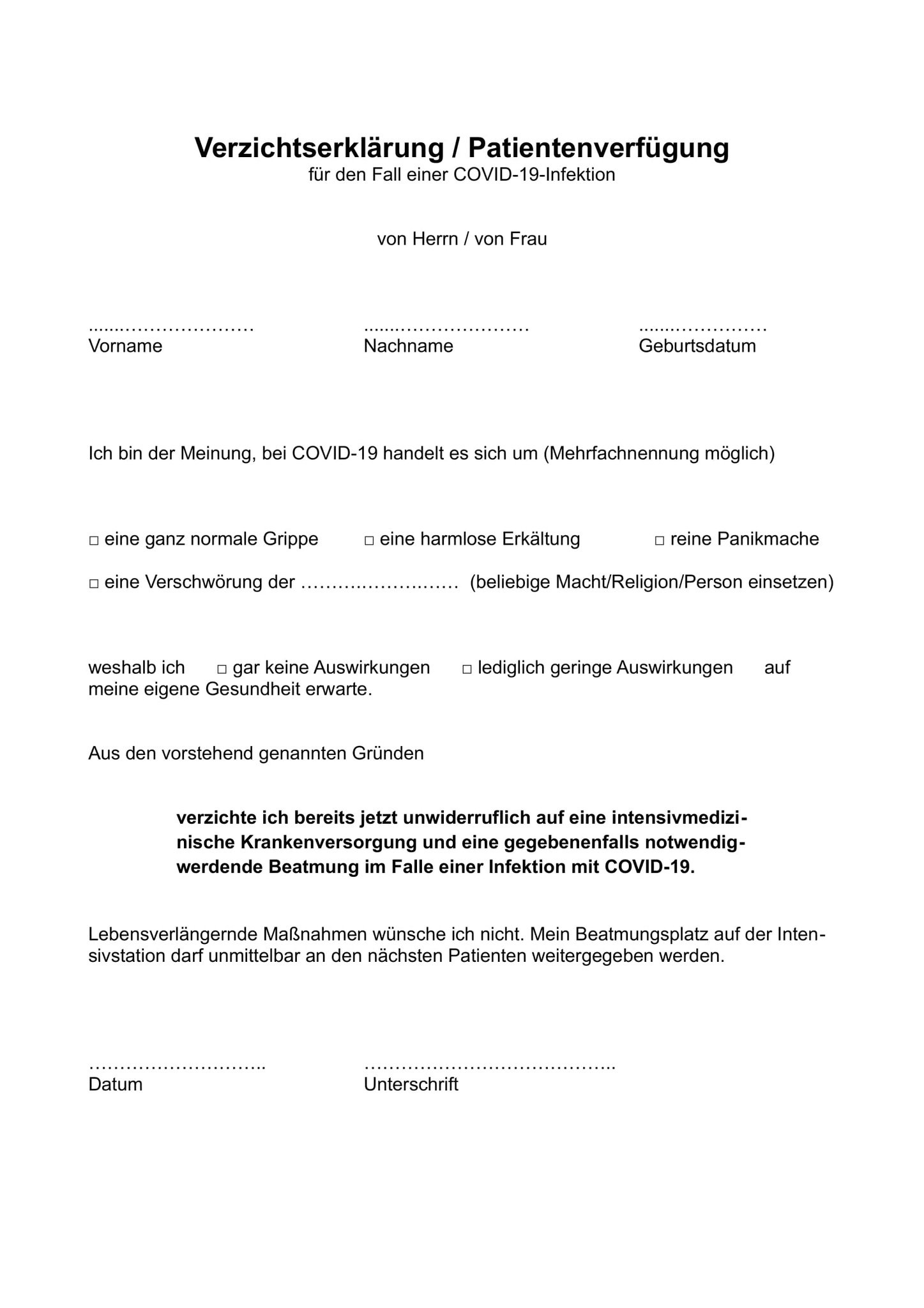 Der behandelnde arzt ist dazu verpflichtet alles zu unternehmen um ihr leben zu erhalten. Vordrucke sind selten eine gute idee.