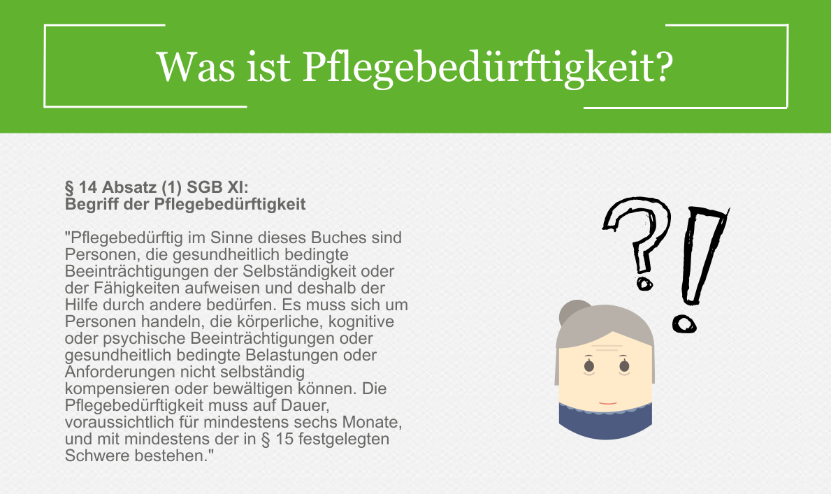Pflegebedürftigkeit definition sgb xi. Auch zu diesem merkmal der pflegebedürftigkeit enthält 14 sgb xi klare definitionen. Beziehen sie sich bitte bei der beantwortung auf den zeitraum ab der antragsstellung. Auszug aus 14 sgb xi. Im bereich der körperpflege das waschen duschen baden die zahnpflege das kämmen rasieren die darm und blasenentleerung.