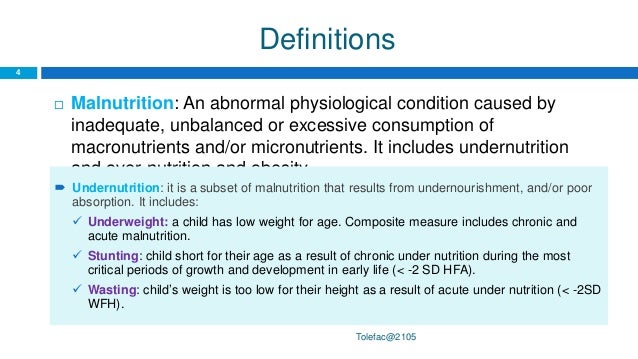 Undernutrition malnutrition definition. The term malnutrition addresses 3 broad groups of conditions. Micronutrient related malnutrition which includes micronutrient deficiencies a lack of important vitamins and minerals or micronutrient excess. Undernutrition occurs when they lack nutrients because they eat too little food overall. This report card primarily uses the term undernutrition defined as the outcome of insufficient food intake hunger and repeated infectious diseases.